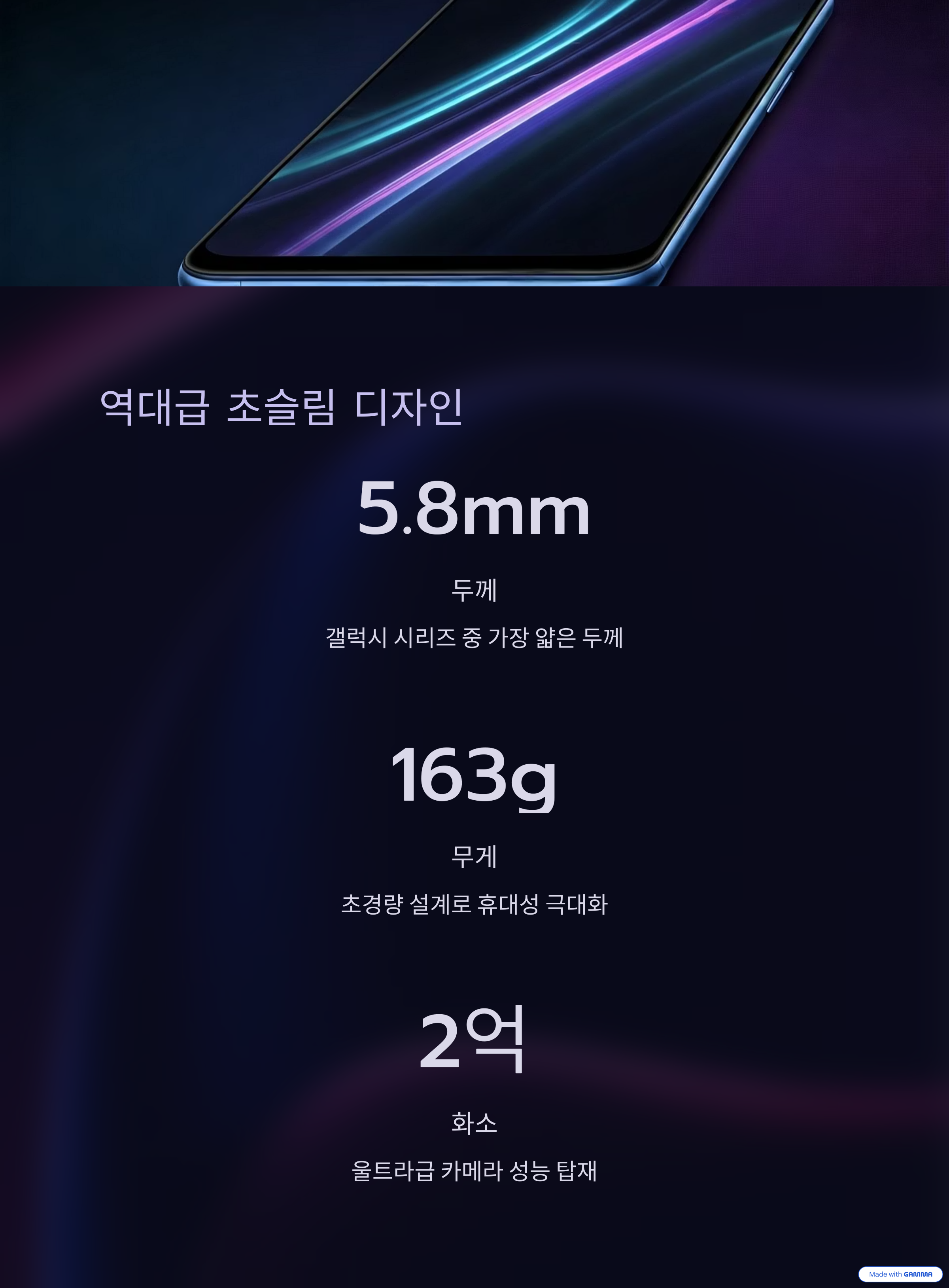 - 두께 5.8mm, 무게 163g – 갤럭시 시리즈 중 역대급 초슬림∙초경량