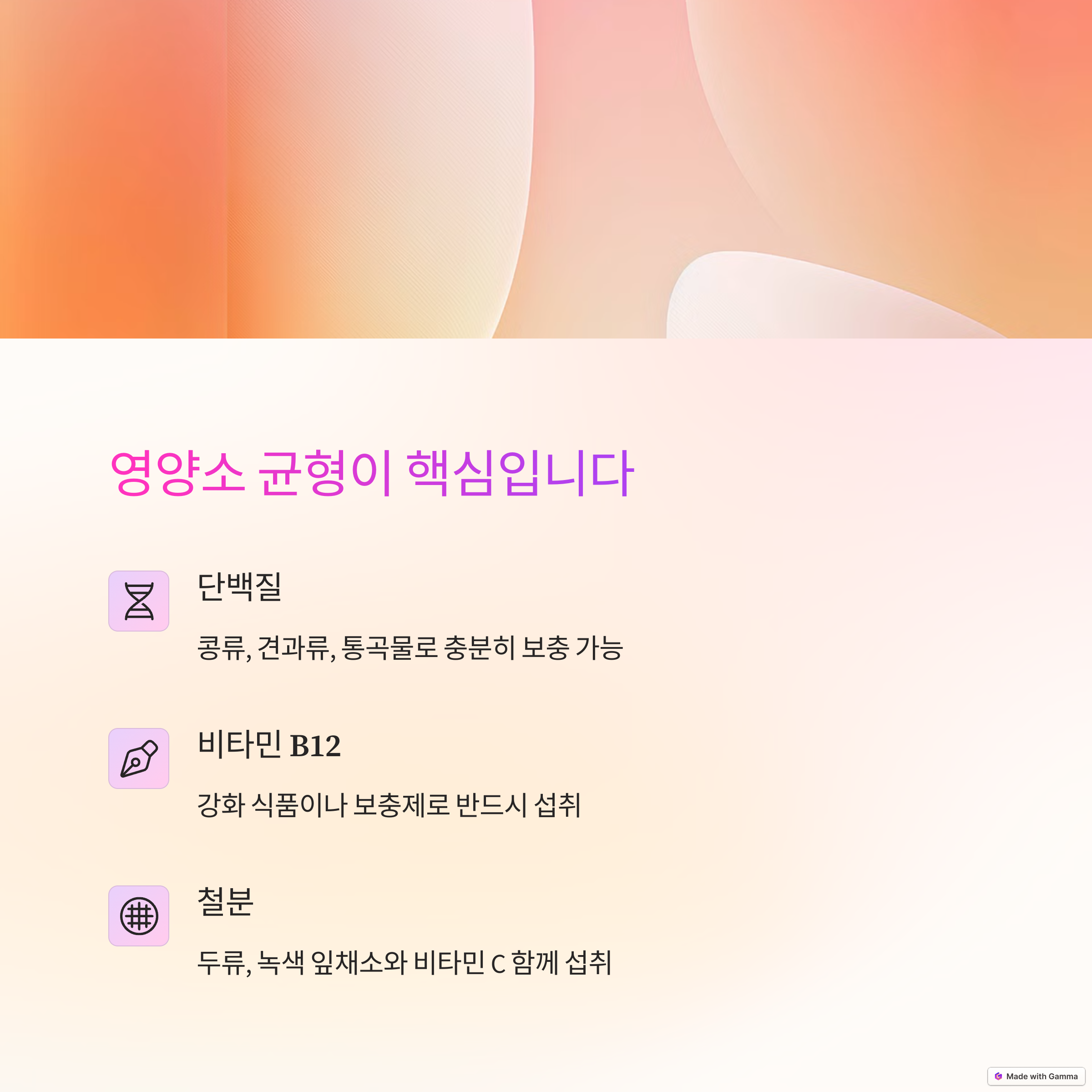 | 철분, 아연, 오메가3 등도 고려해야 합니다. | 보충제 또는 강화 식품으로 섭취해야 합니다. | 콩, 두부, 렌틸콩, 견과류 등 활용이 필요합니다. |