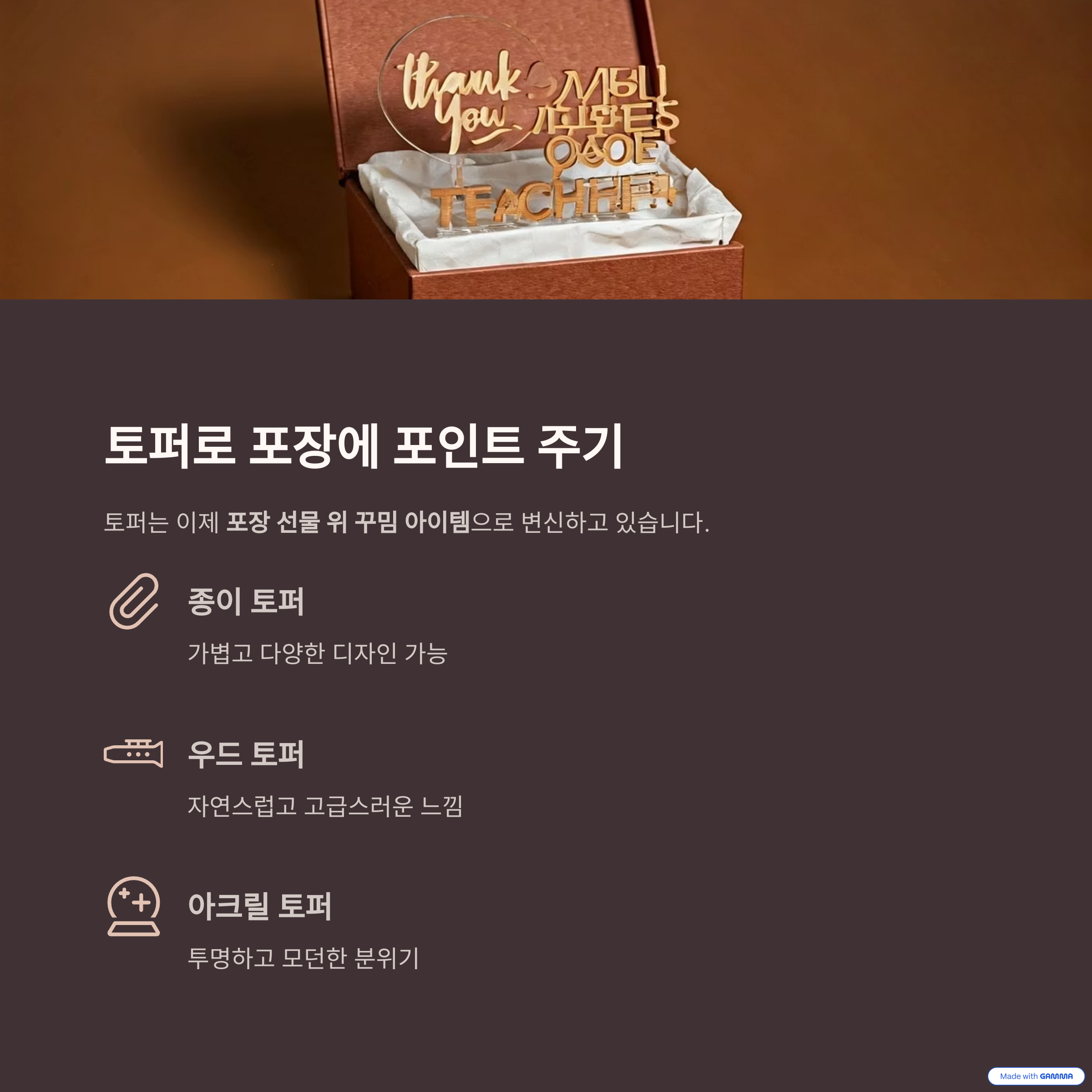 종이, 우드, 아크릴 재질 토퍼를 선물 박스나 파우치에 꽂으면 하나의 오브제 역할을 합니다.