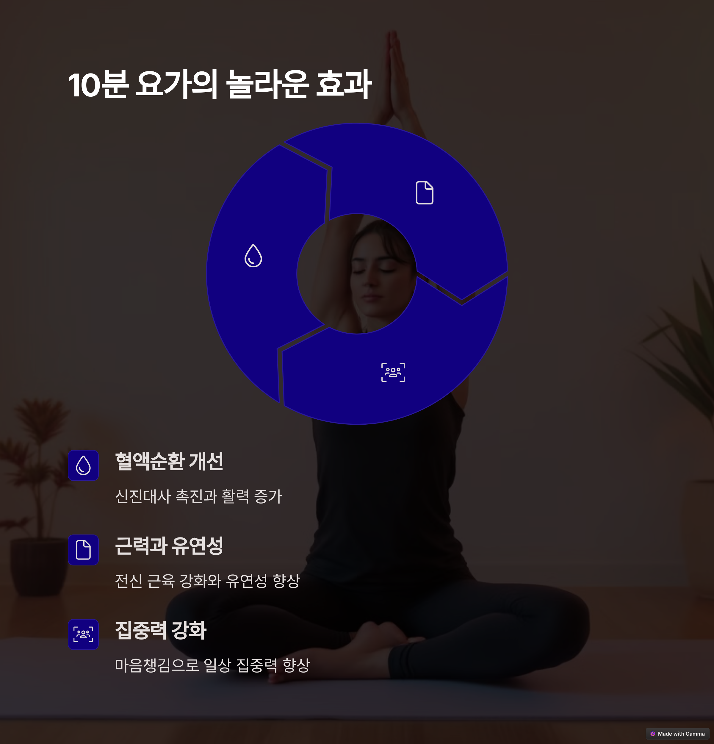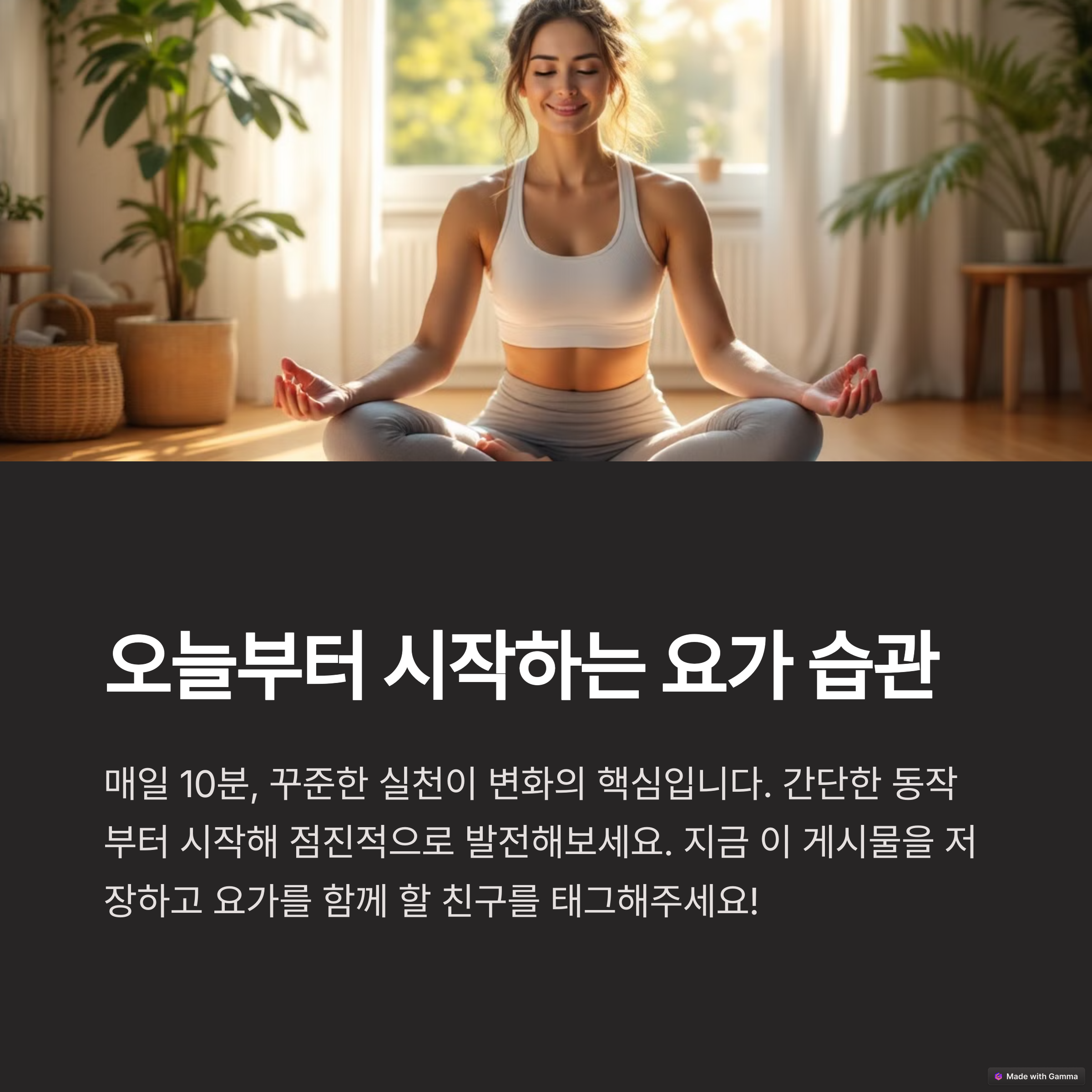 요가는 단순한 유연성 향상이나 체형 교정에 그치지 않습니다. 내면의 긴장을 풀고, 정적인 시간을 통해 자신과 마주할 수 있도록 돕는 삶의 도구입니다. 현대 사회의 빠른 리듬 속에서 지친 몸과 마음을 달래기 위한 가장 순한 방법이기도 하지요. 오늘부터 하루 10분, 나를 위한 요가 시간을 시작해 보세요. 이 작은 습관이 가져올 변화는 생각보다 클 수 있습니다. 요가를 통해 건강한 자세와 마음의 평온을 회복하시길 바랍니다.