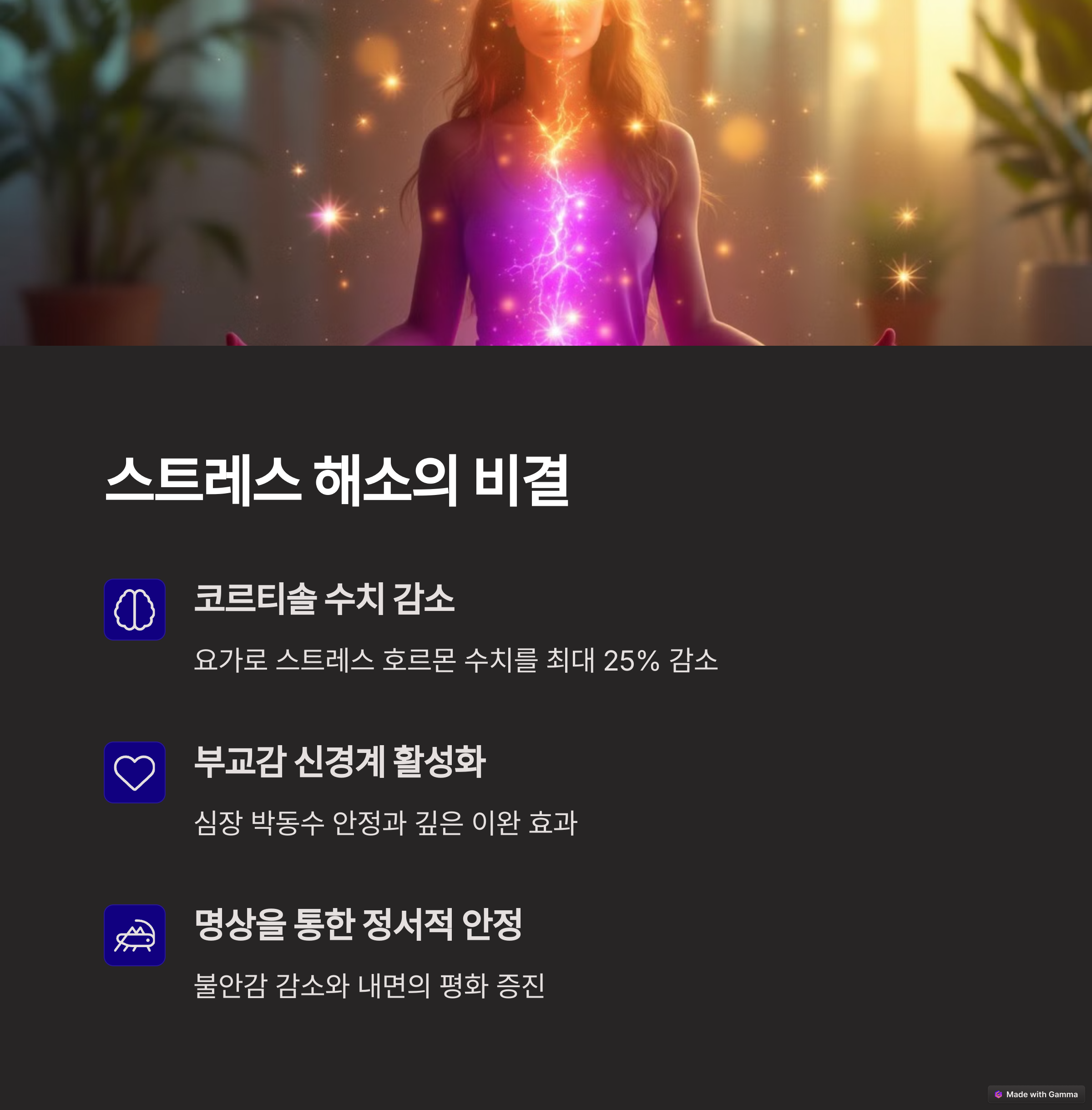 | 스트레스 완화와 피로 회복에 도움 | 척추와 골반 정렬 유지에 효과 | 내면의 평화와 집중력 향상 |