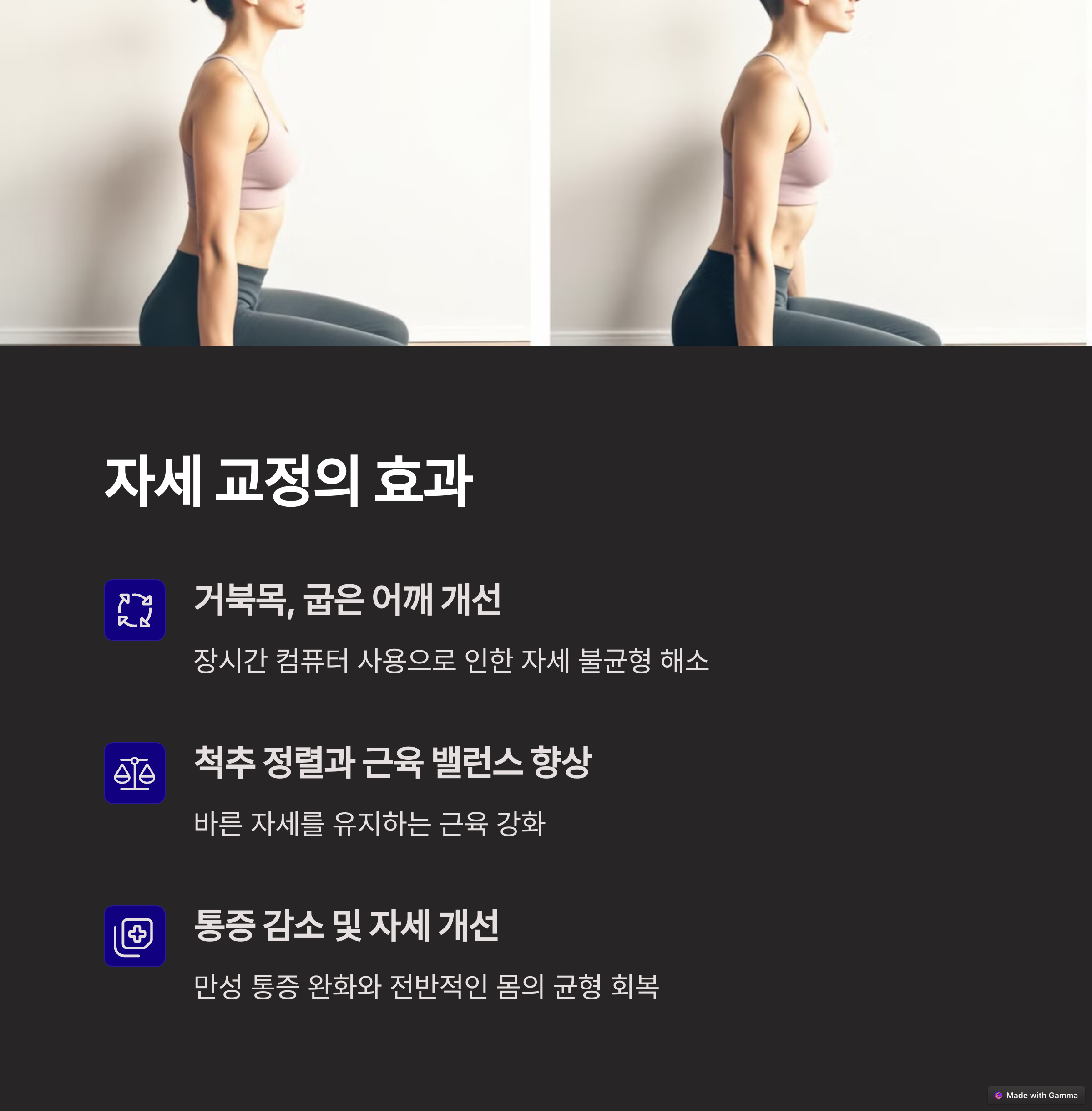 | 바른 자세 회복 | 척추 정렬과 균형 감각 회복에 효과적입니다. |