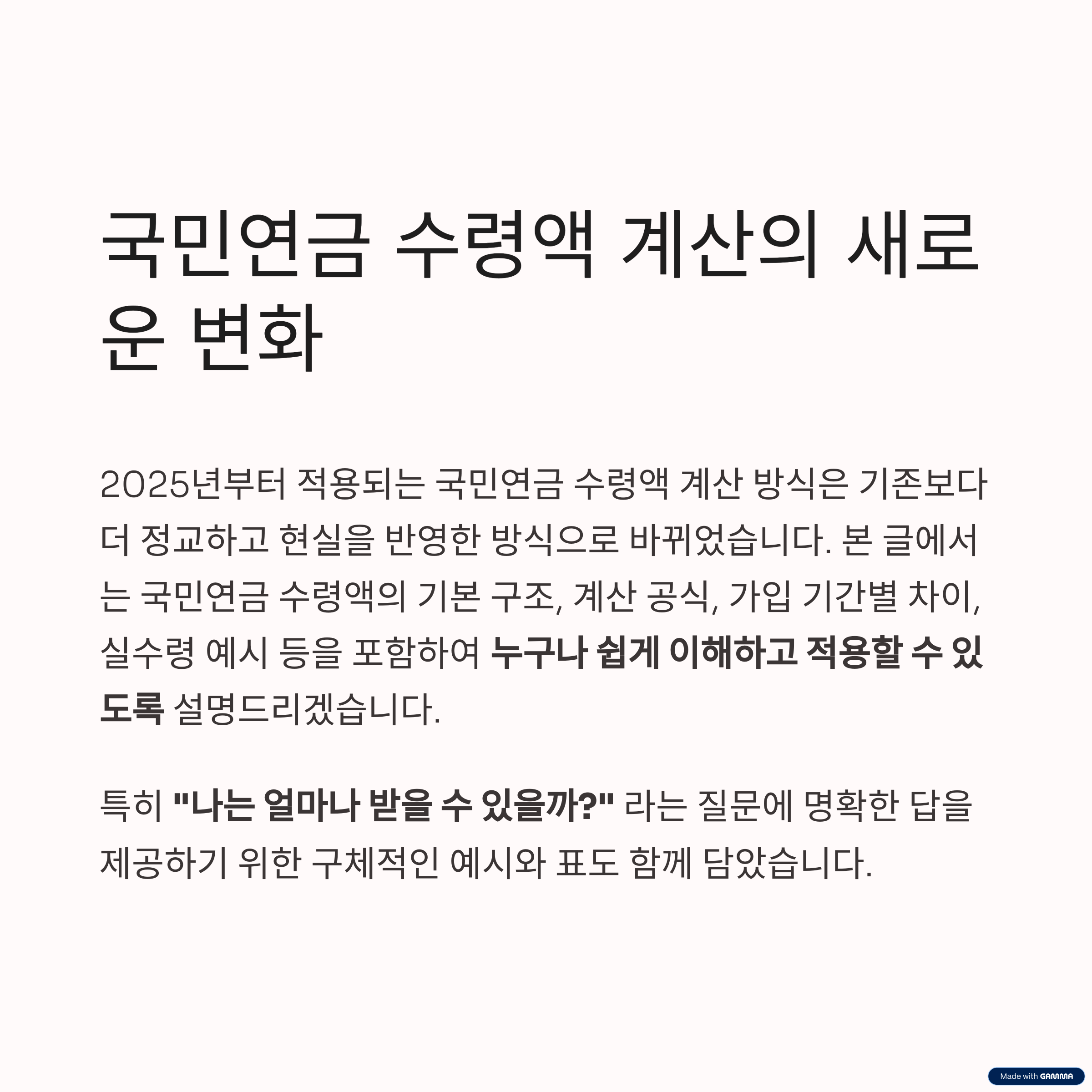 2025년부터 적용되는 국민연금 수령액 계산 방식은 기존보다 더 정교하고 현실을 반영한 방식으로 바뀌었습니다. 본 글에서는 국민연금 수령액의 기본 구조, 계산 공식, 가입 기간별 차이, 실수령 예시 등을 포함하여 누구나 쉽게 이해하고 적용할 수 있도록 설명드리겠습니다. 특히 "나는 얼마나 받을 수 있을까?" 라는 질문에 명확한 답을 제공하기 위한 구체적인 예시와 표도 함께 담았습니다.