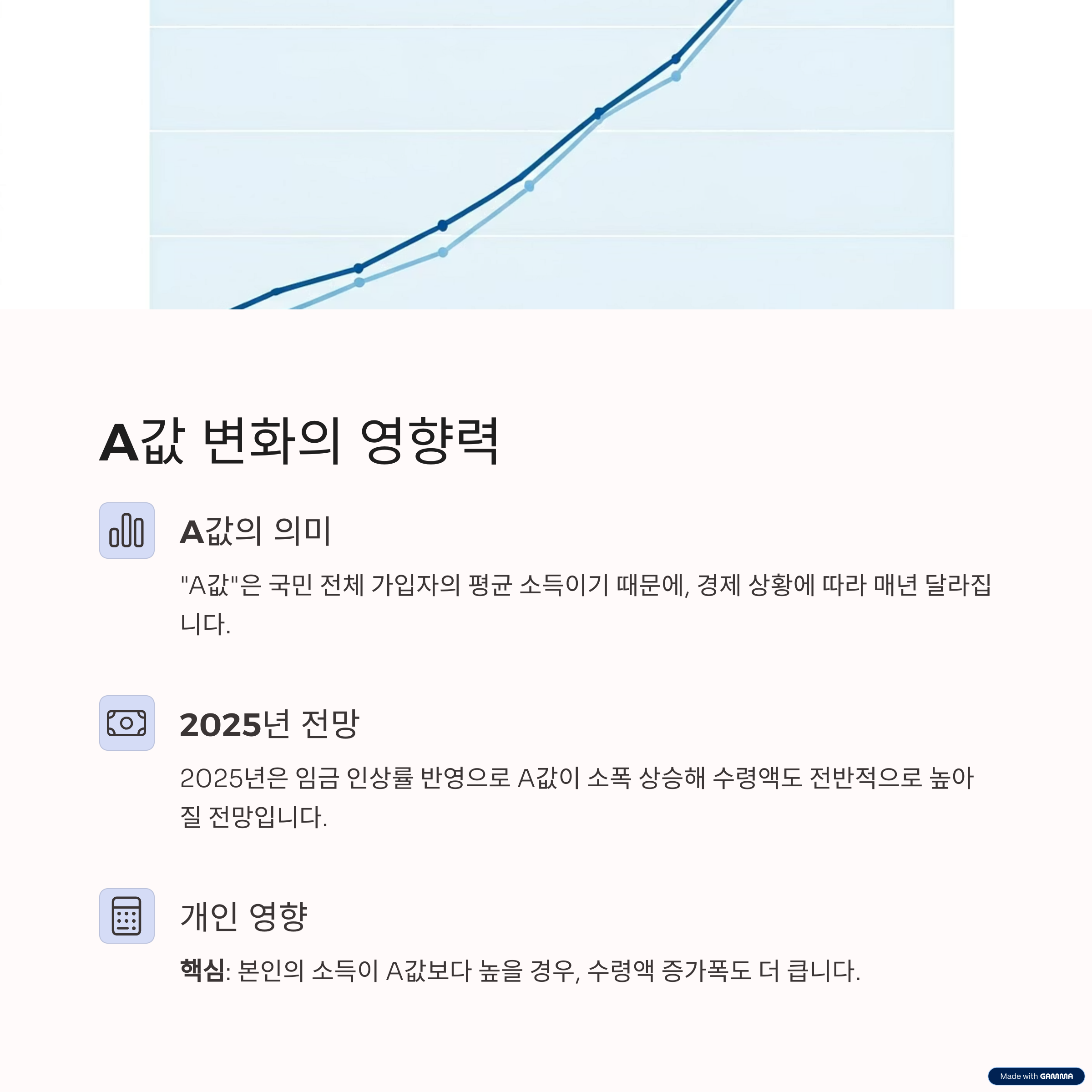 2025년은 임금 인상률 반영으로 A값이 소폭 상승해 수령액도 전반적으로 높아질 전망입니다.