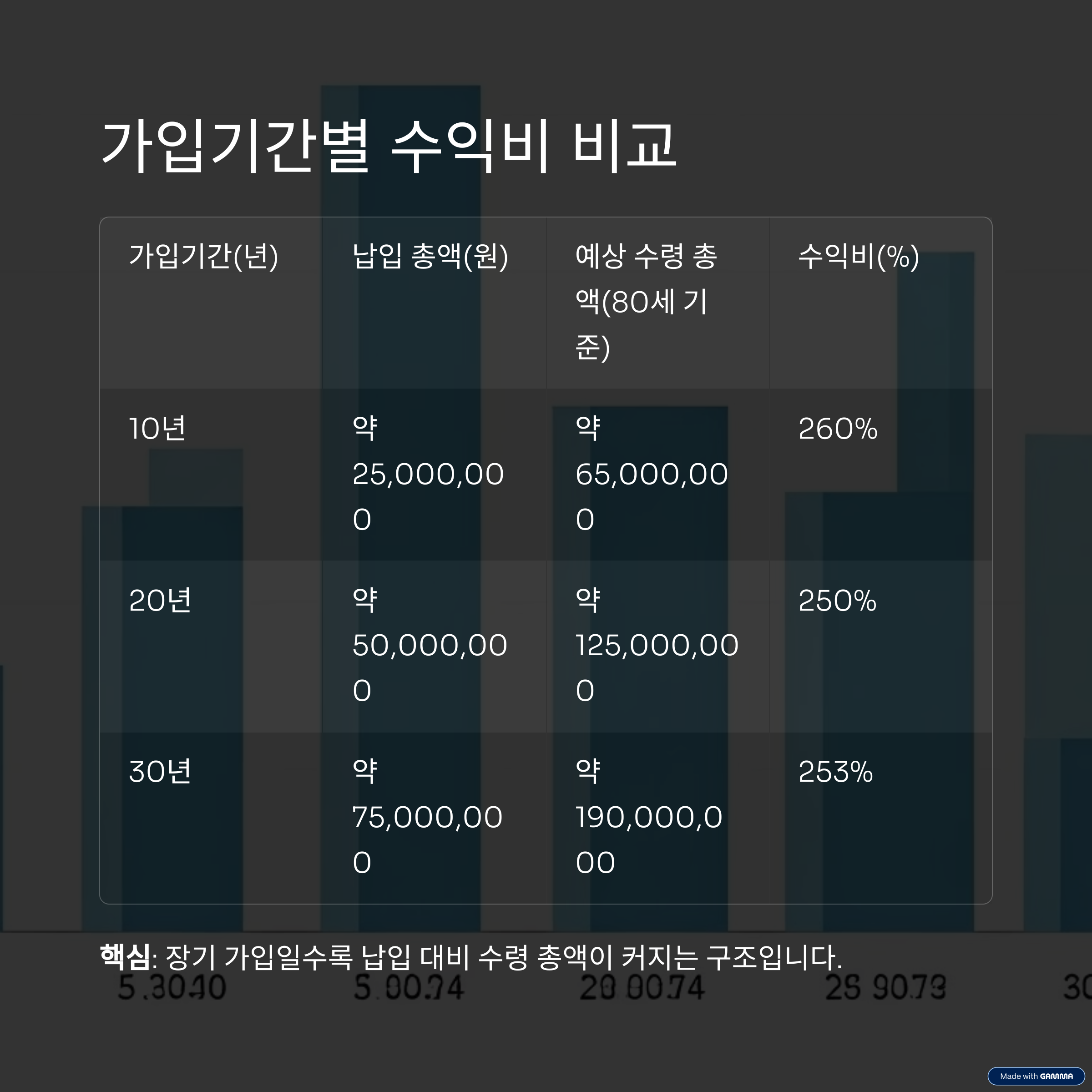 핵심: 장기 가입일수록 납입 대비 수령 총액이 커지는 구조입니다.