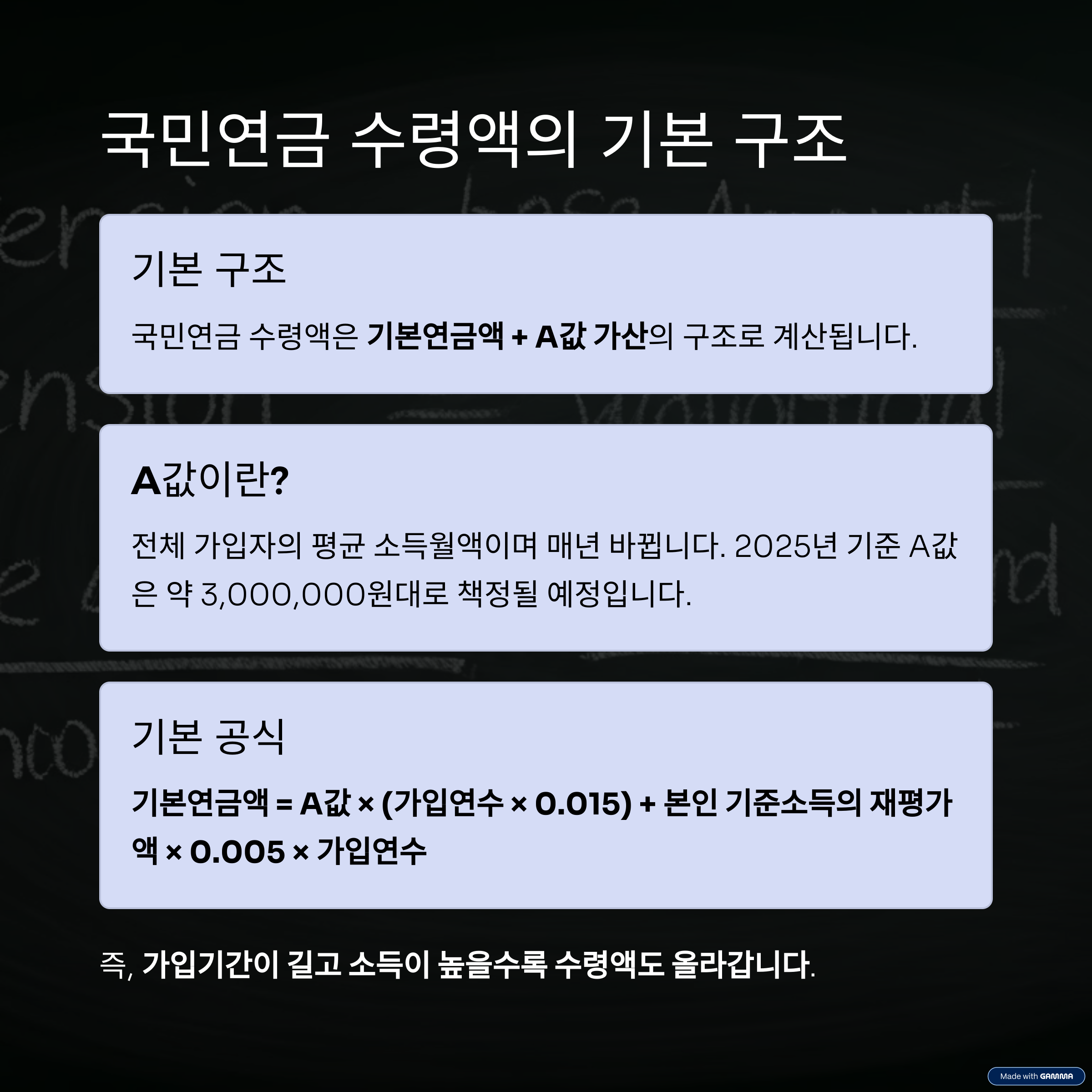 국민연금 수령액은 기본연금액 + A값 가산의 구조로 계산됩니다.