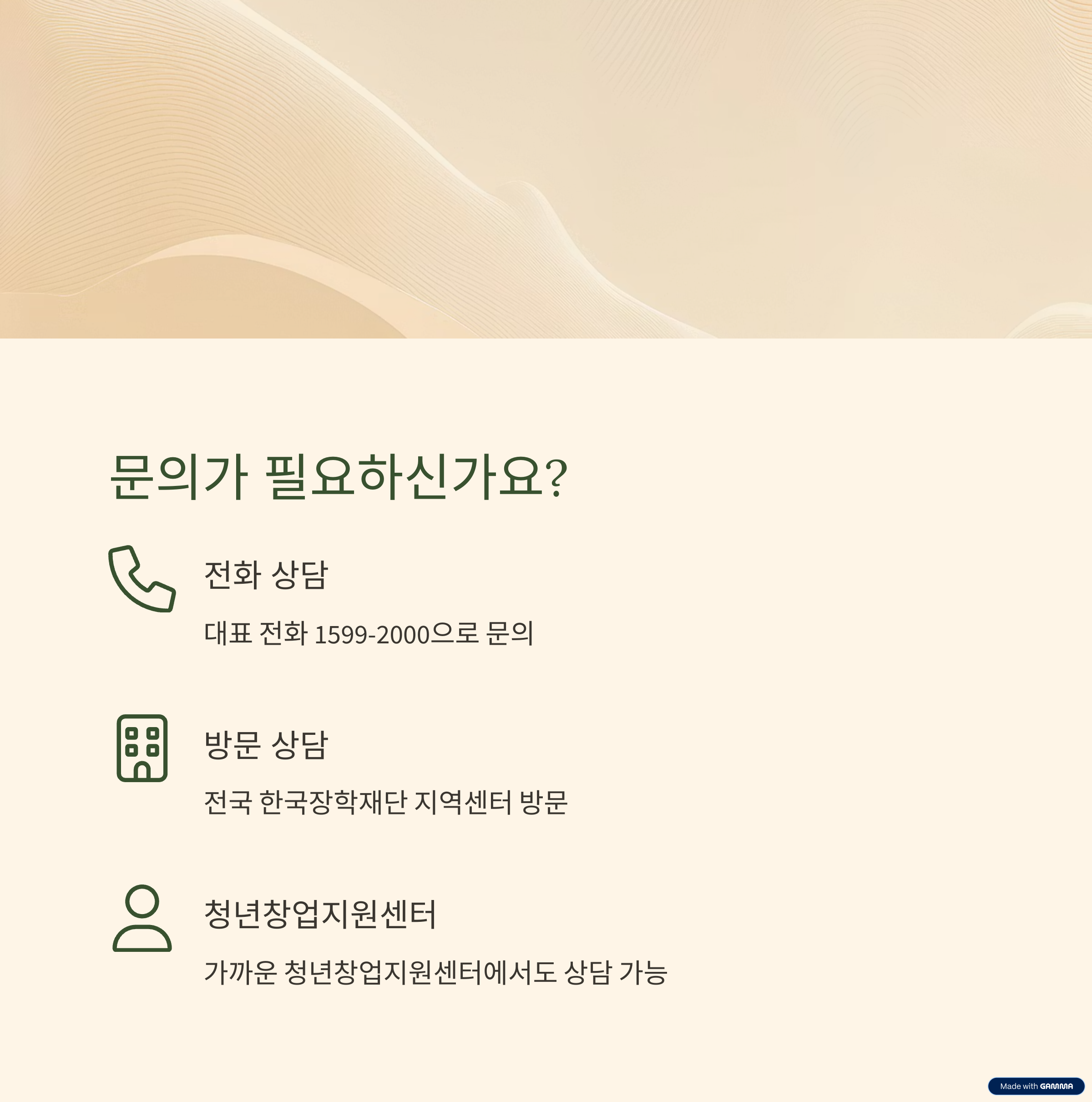 - 전국 한국장학재단 지역센터 또는 청년창업센터 방문 상담 가능
