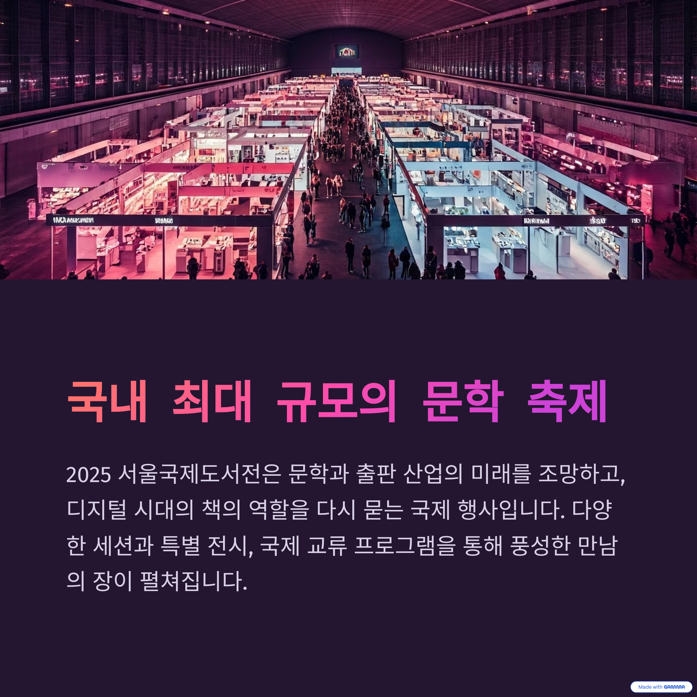 2025 서울국제도서전은 전 세계 출판인과 작가, 독자가 한자리에 모이는 국내 최대 규모의 도서 박람회입니다.