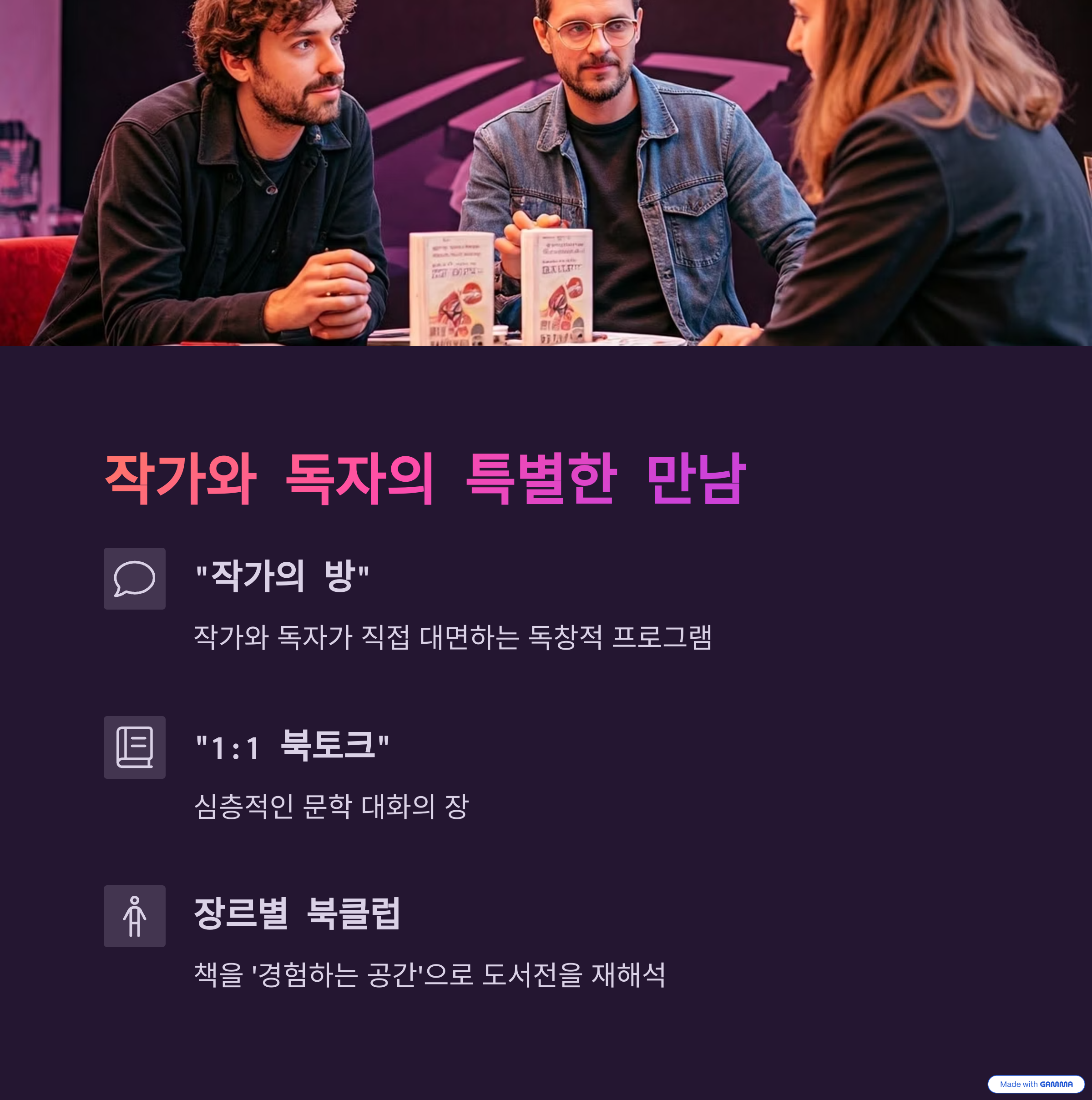"작가의 방", "1:1 북토크"와 같은 독창적 프로그램이 주목받고 있습니다.