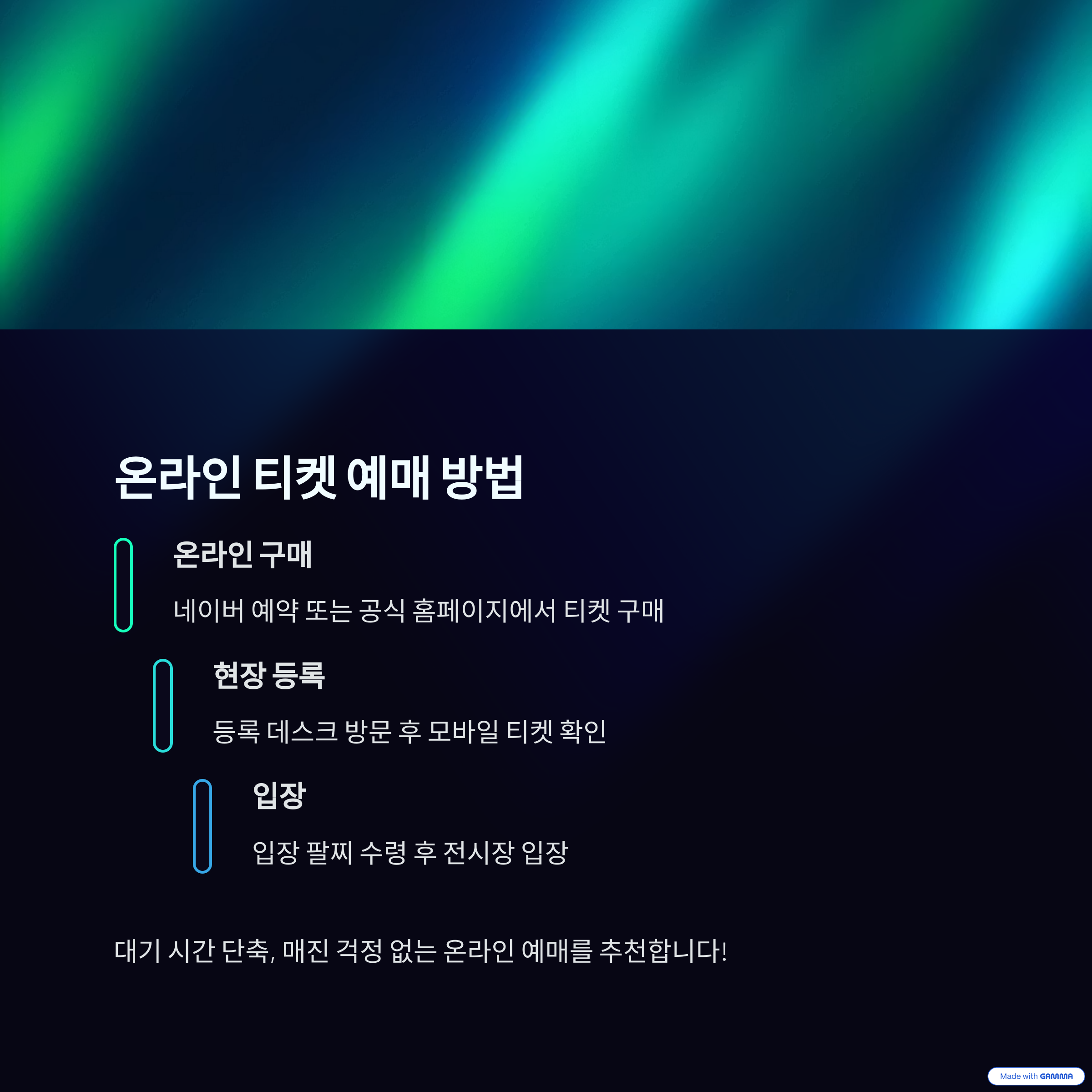 온라인 티켓 구매 → 현장 등록 데스크 방문 → 모바일 티켓 확인 → 입장 팔찌 수령 → 전시장 입장 - 장점: 대기 시간 단축, 매진 걱정 없음