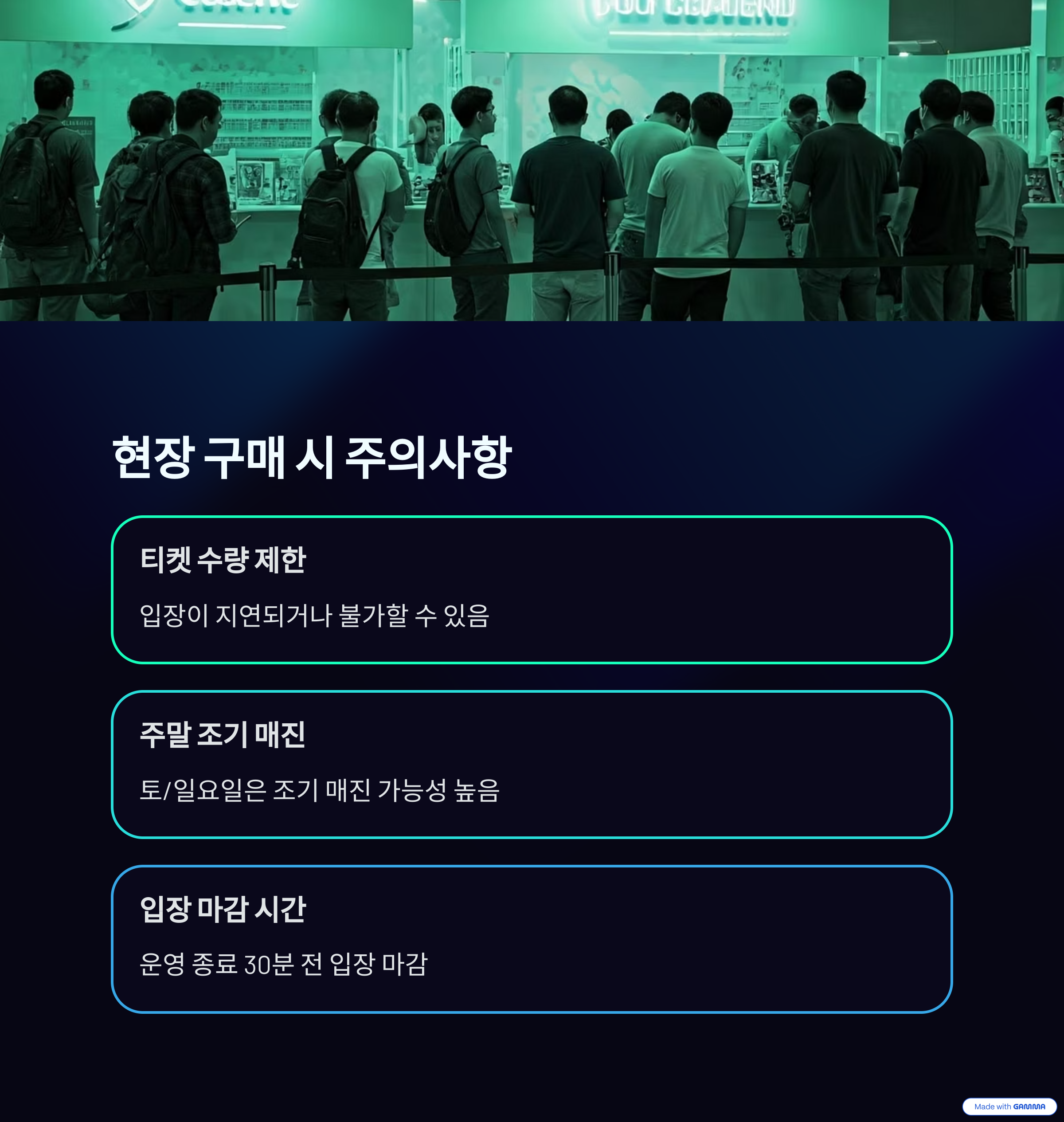 티켓 수량 제한으로 인해 입장이 지연되거나 불가할 수 있음