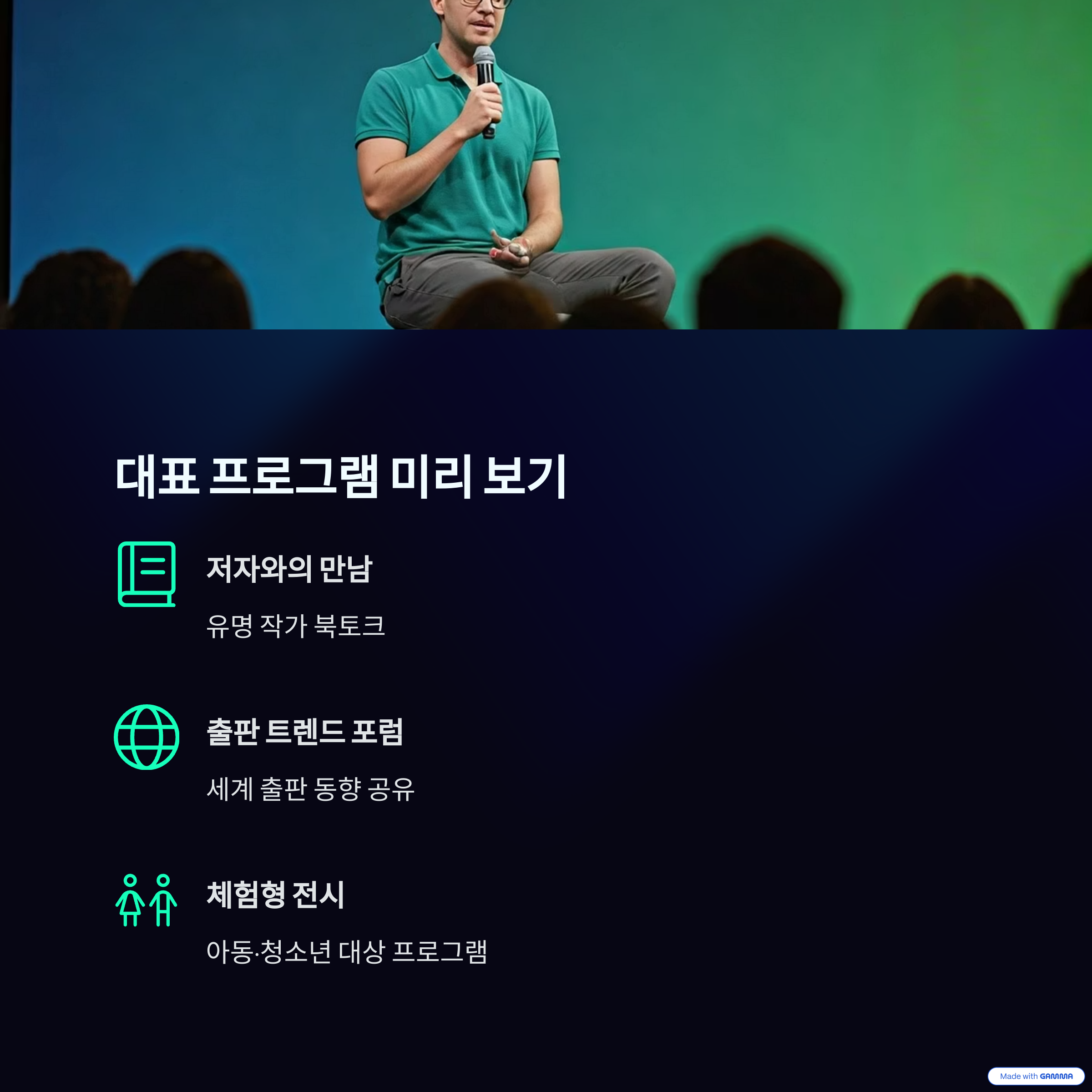 신간 도서, 특별 강연, 저작권 교류 행사 등 다채로운 프로그램이 준비되어 있습니다.