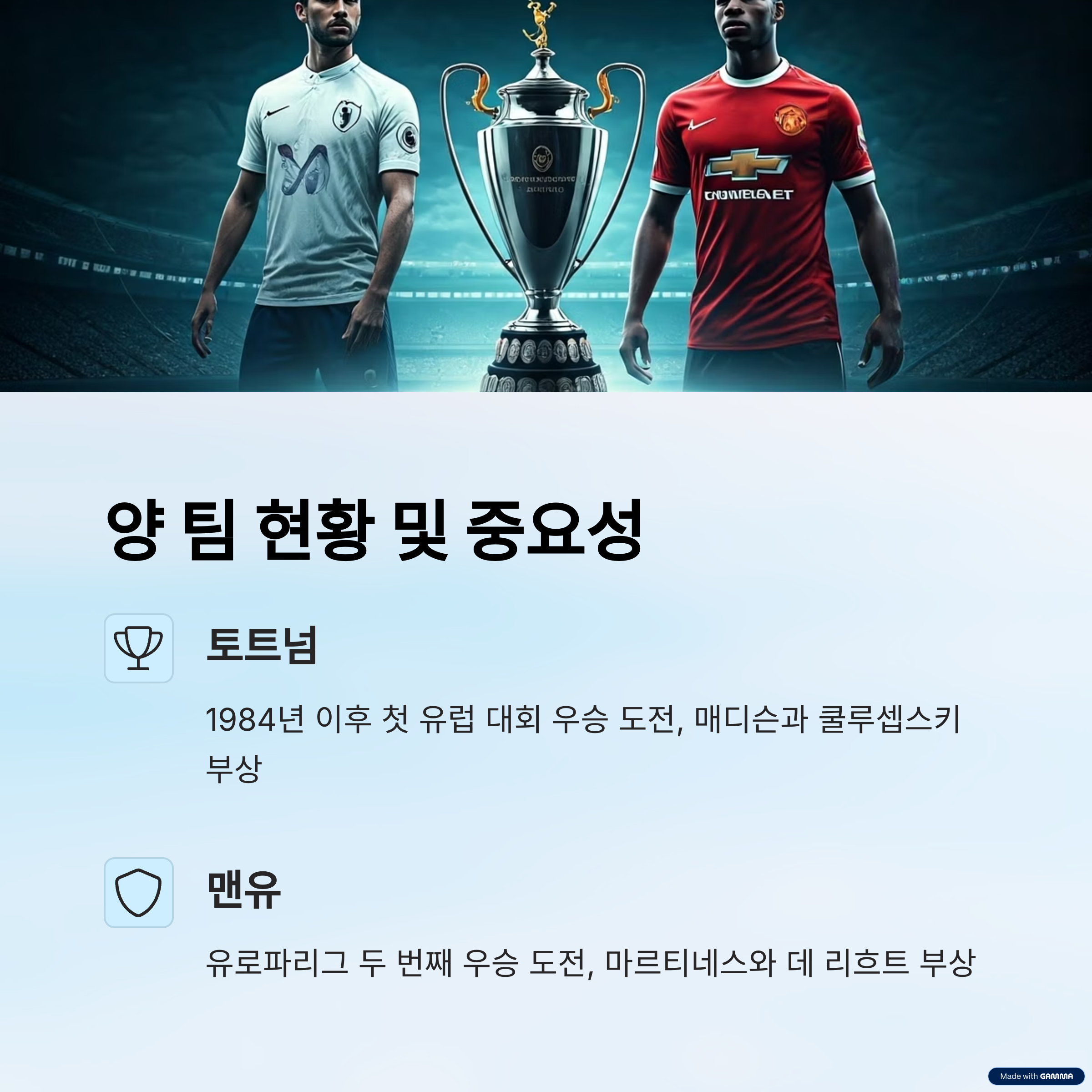 이번 결승전은 두 팀 모두에게 중요한 의미를 갖습니다. 토트넘은 1984년 이후 첫 유럽 대회 우승을 노리고 있으며, 맨체스터 유나이티드는 유로파리그 통산 두 번째 우승을 목표로 하고 있습니다. 인스타그램+1m.site.naver.com+1Nate News