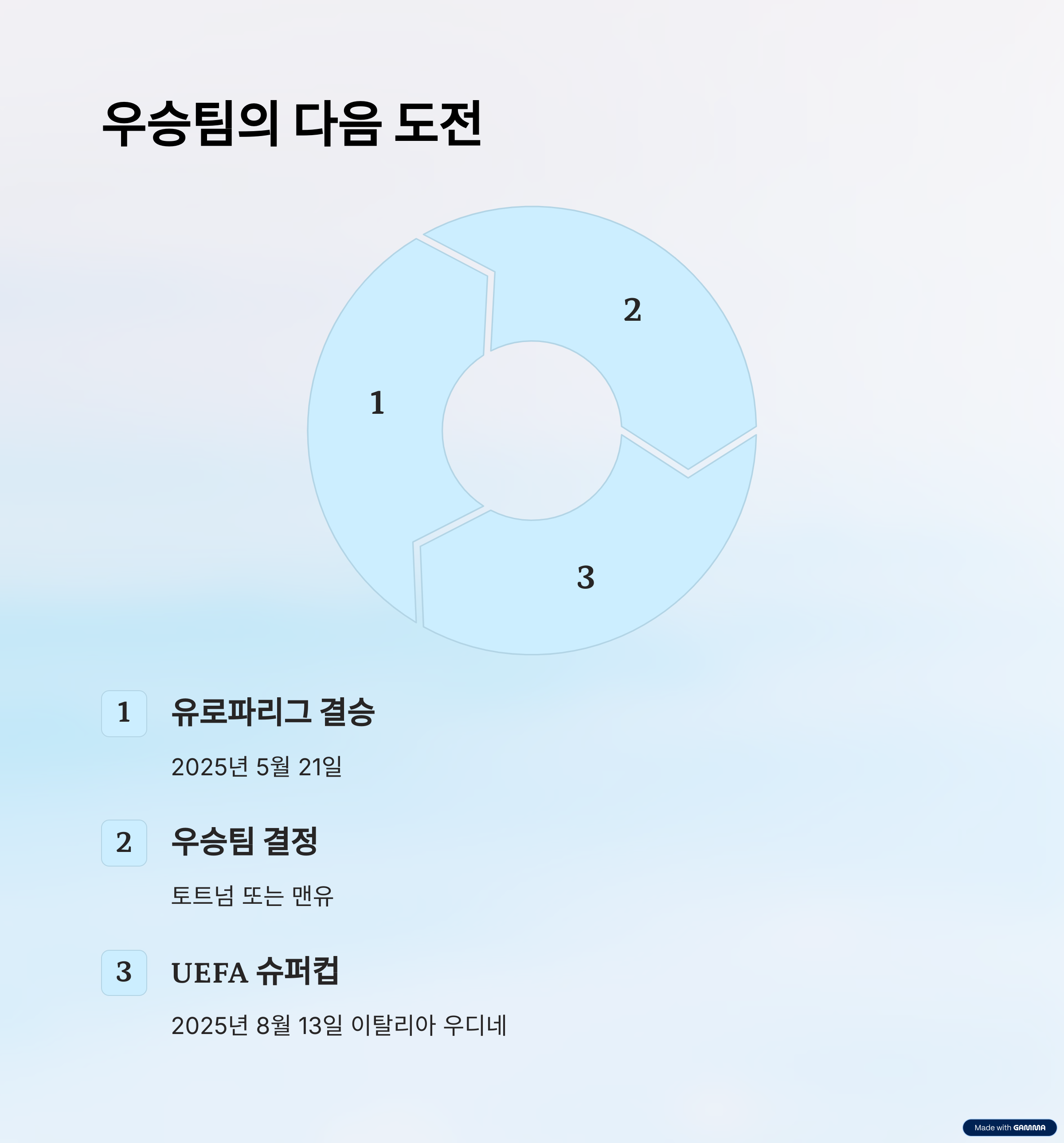 이번 유로파리그 우승팀은 2025년 8월 13일 이탈리아 우디네에서 열리는 UEFA 슈퍼컵에서 챔피언스리그 우승팀과 맞붙게 됩니다. m.site.naver.com